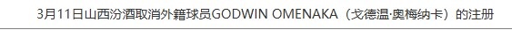 2025-03-11 21:35:16山西男篮取消戈德温-奥梅纳卡的注册 并为凯西-普拉瑟完成注册