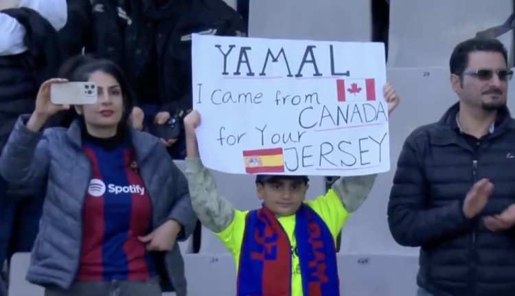 2025-03-12 03:18:51远渡重洋!现场小球迷手举横幅:我来自加拿大,想要亚马尔的球衣