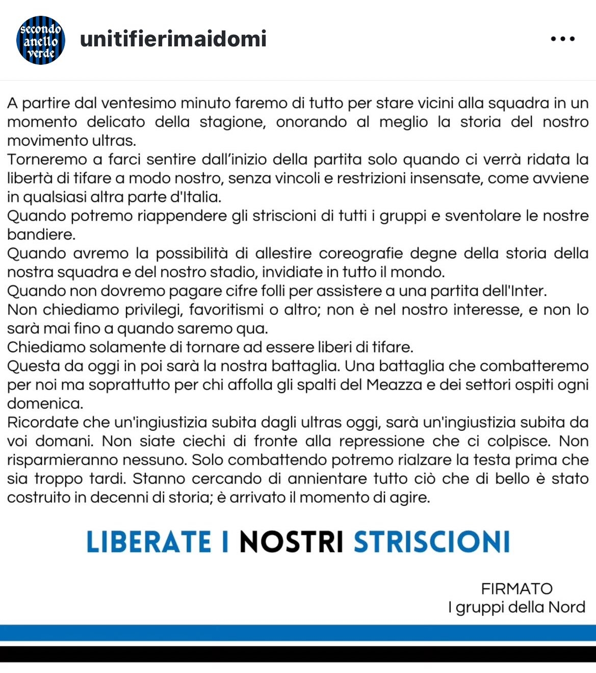 只有当我们重新获得以自己的方式欢呼的自由时,我们才会重新让自己的声音响起。不受毫无意义的约束和限制,就像在意大利的任何其他球场发生的那样。